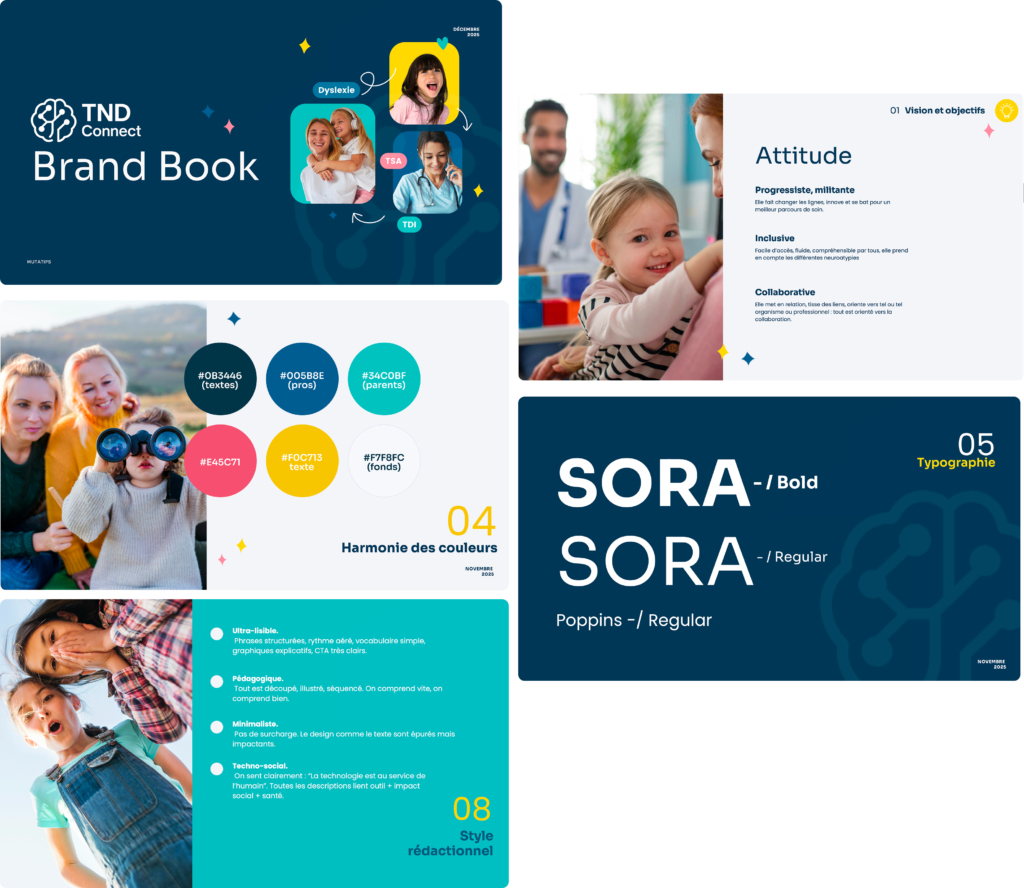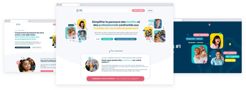 C’est là que ça devient intéressant, et c’est là que beaucoup d’acteurs de la santé se trompent : L’univers des TND est saturé de communications dans les tons bleu-gris institutionnel, de visuels d’enfants de banque d’image gratuites, d’interfaces qui ressemblent à des formulaires administratifs numérisés. C’est compréhensible : c’est un sujet sérieux. Mais parents qui arrivent sur TNDConnect ont déjà suffisamment de lourdeur dans leur quotidien. La dernière chose dont ils ont besoin, c’est que l’outil censé les aider leur rappelle visuellement que la situation est grave.